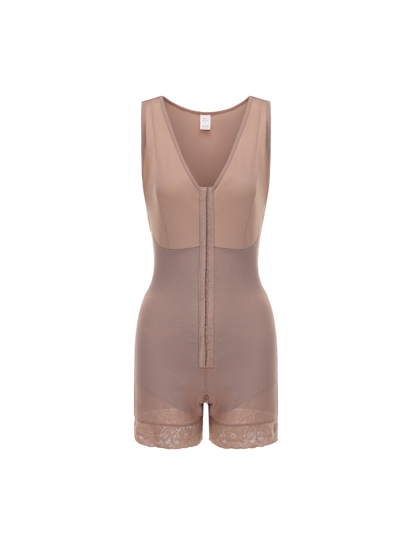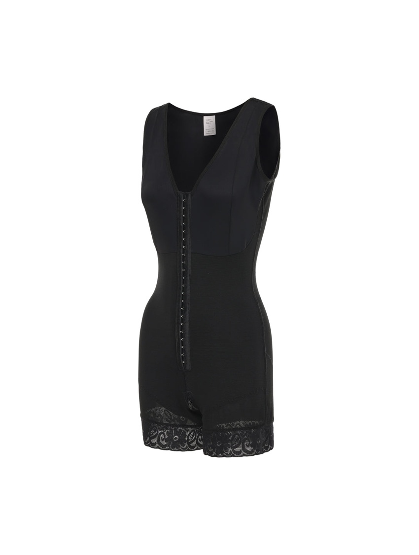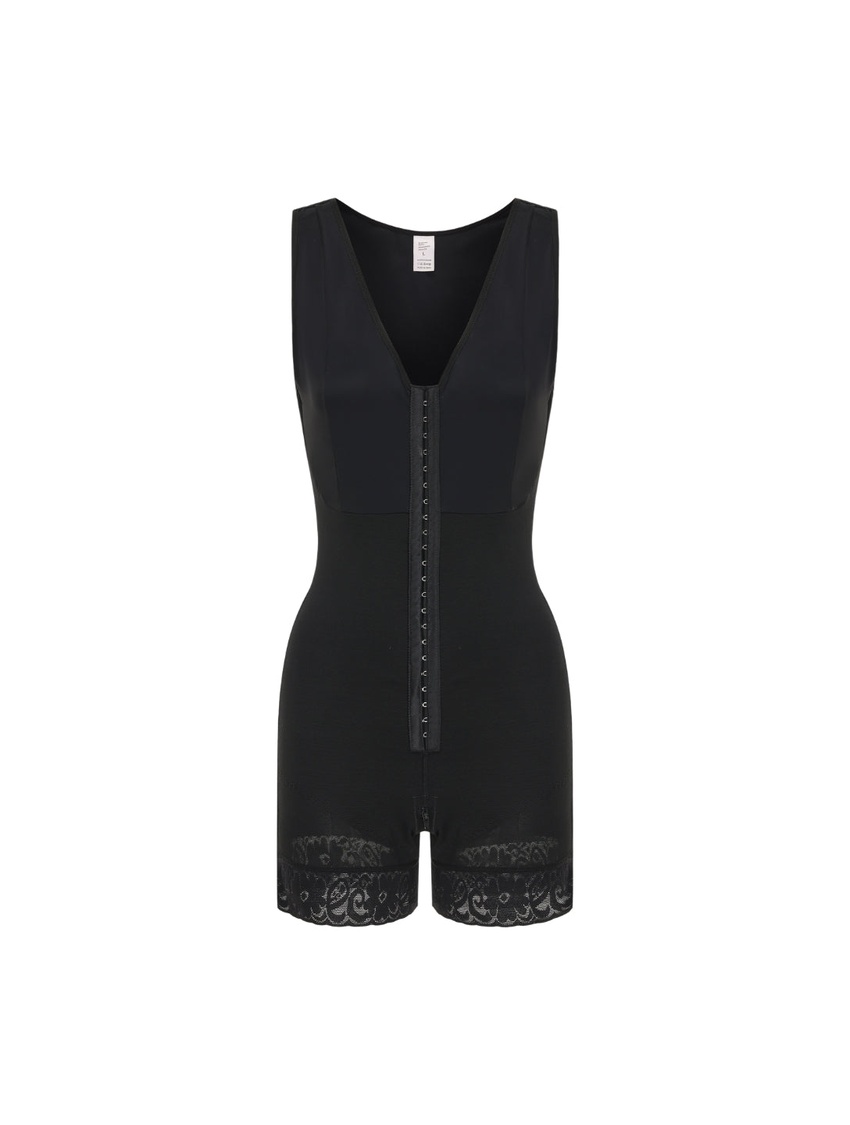 - Targeted compression shaping that flattens the midsection, smooths hips and thighs, and subtly lifts the bust