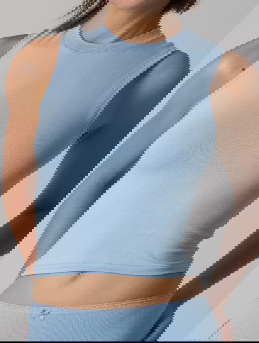 The high-neck cut adds a modern, refined touch—perfect for layering, lounging, or styling as a standalone statement piece. It’s lightweight, comfortable, and thoughtfully cut to hit at the ideal length for pairing with high-waisted bottoms.