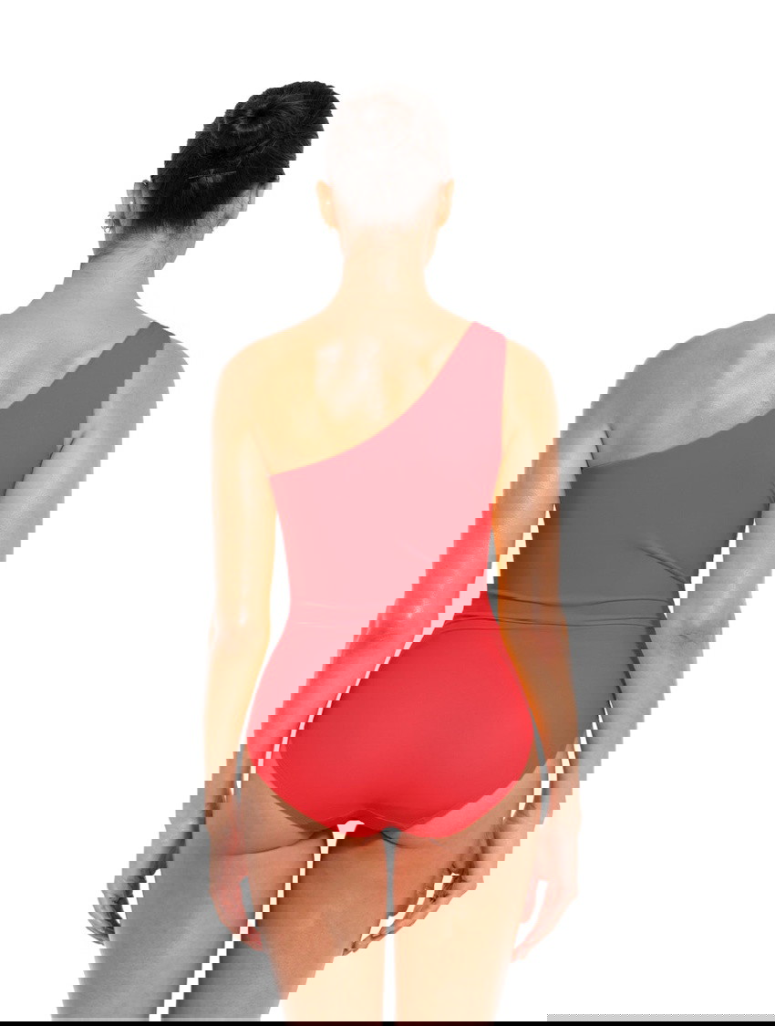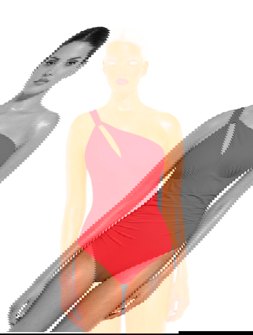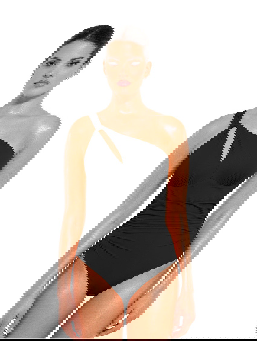 The double-layer build pairs a high-stretch outer swim fabric with a sculpting inner mesh to enhance your curves. The asymmetrical one-shoulder design and bold cut-out detail add sophistication with a modern edge.