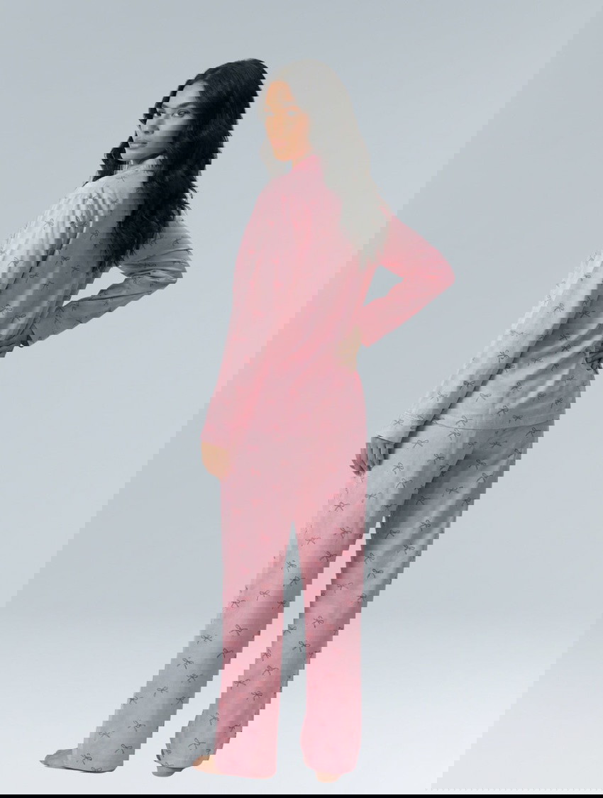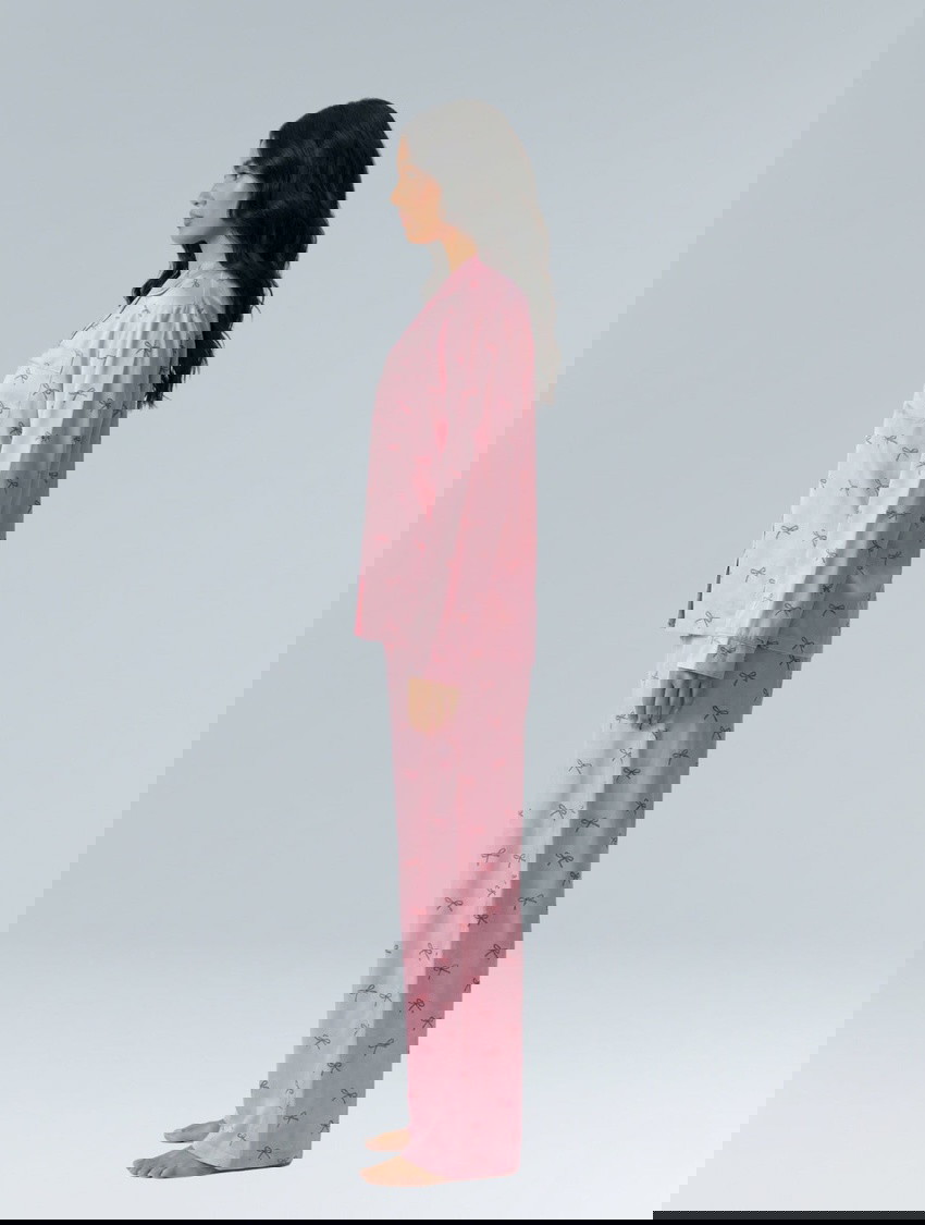 Finished with an all-over bow print and a classic pajama silhouette, it’s ideal for lounging, unwinding, or enjoying a cozy night in. Whether you’re treating yourself or gifting someone special, this pajama set brings comfort with a touch of sweetness.