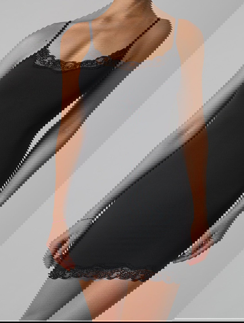Delicate lace trimming graces the neckline and hem, adding a feminine touch while maintaining a sleek, minimal silhouette. Adjustable straps provide a custom fit, while the ultra-lightweight, breathable stretch fabric keeps you comfortable all day long.