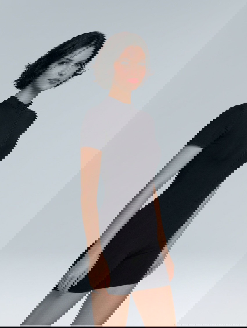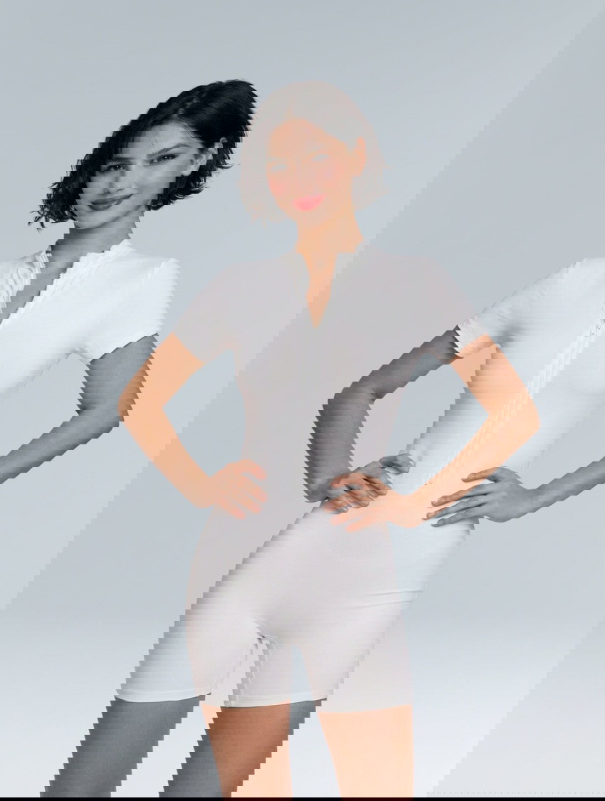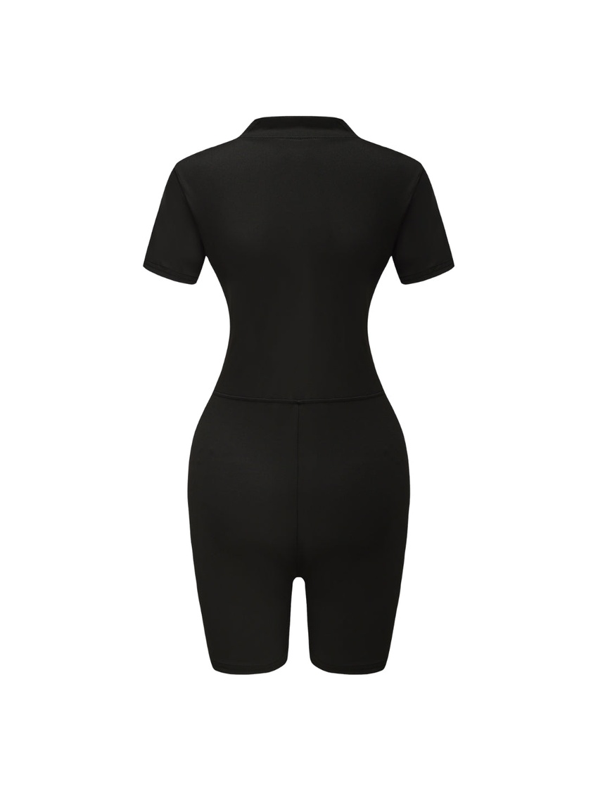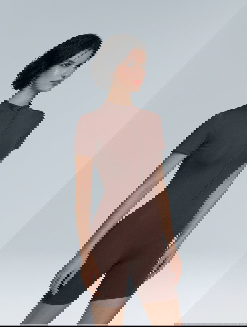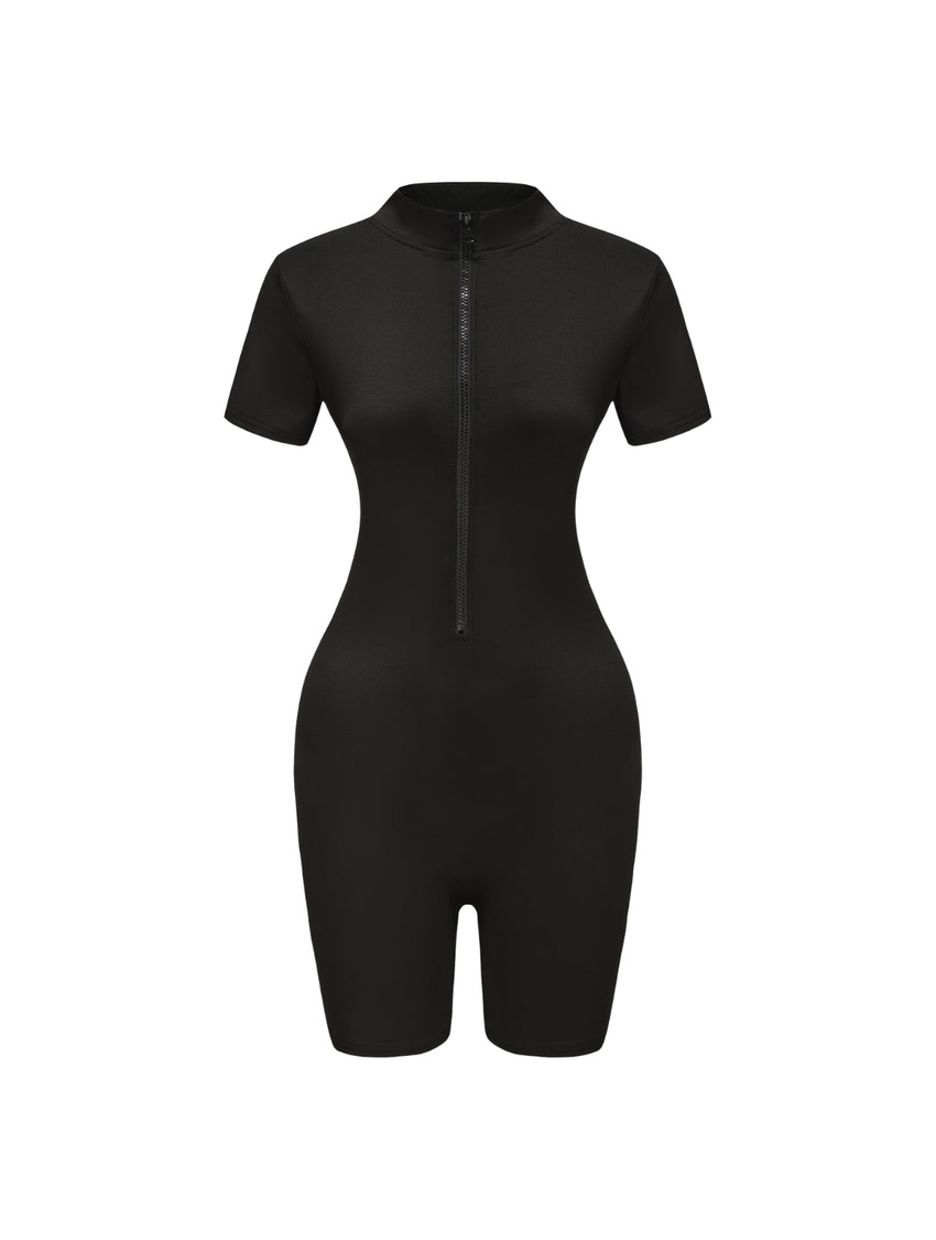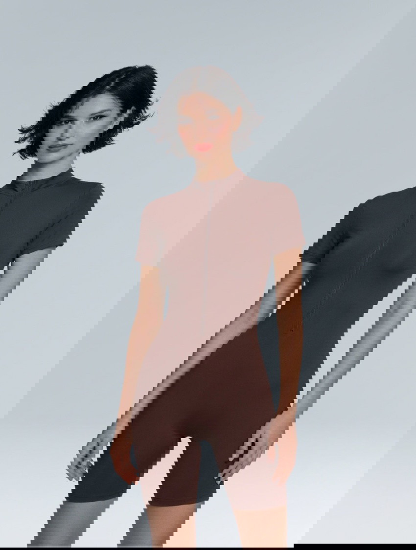 Made with our ultra-smooth, stretchy performance fabric, this piece contours your shape while still feeling weightless and breathable. The mock-neck design and front zipper give you adjustable coverage and a modern, streamlined fit. Short sleeves and mid-thigh shorts offer that perfect balance of comfort and support, making it ideal for both workouts and everyday wear.